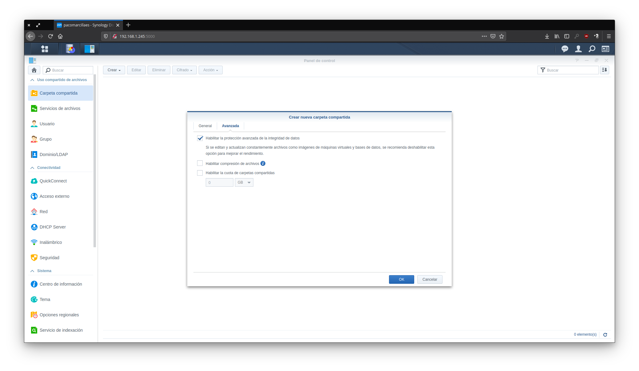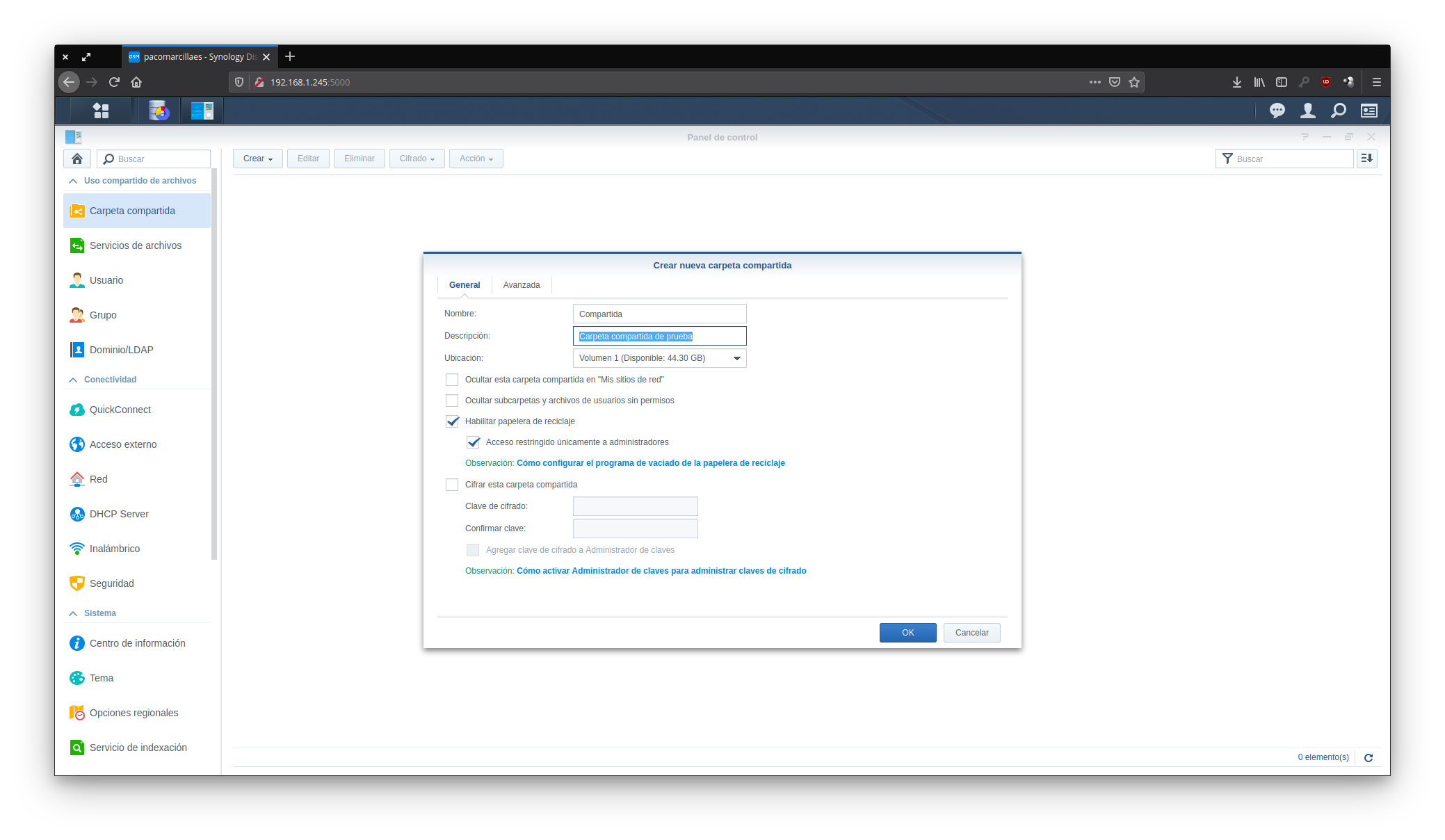 - Para crear una carpeta compartida, ahora debemos ir al panel de control y luego al apartado de carpeta compartida. Pinchamos de nuevo en Crear y nos aparece el asistente. En él podemos poner el nombre, si queremos que aparezca publicada en nuestra red local, habilitar la papelera de reciclaje…