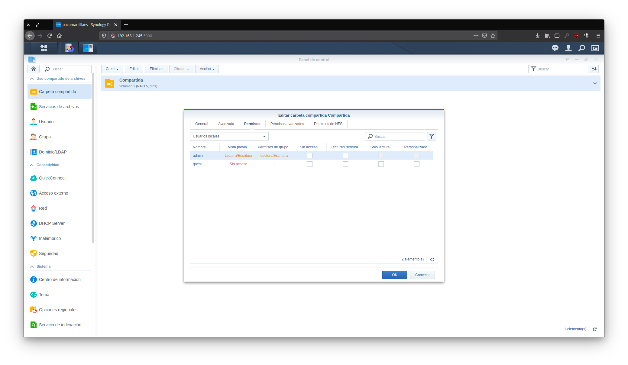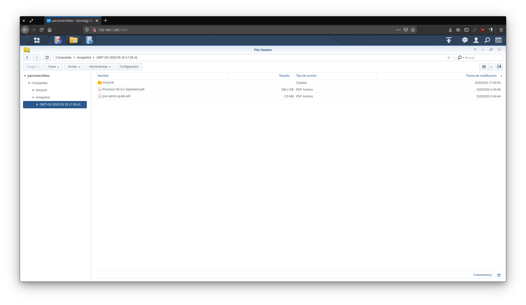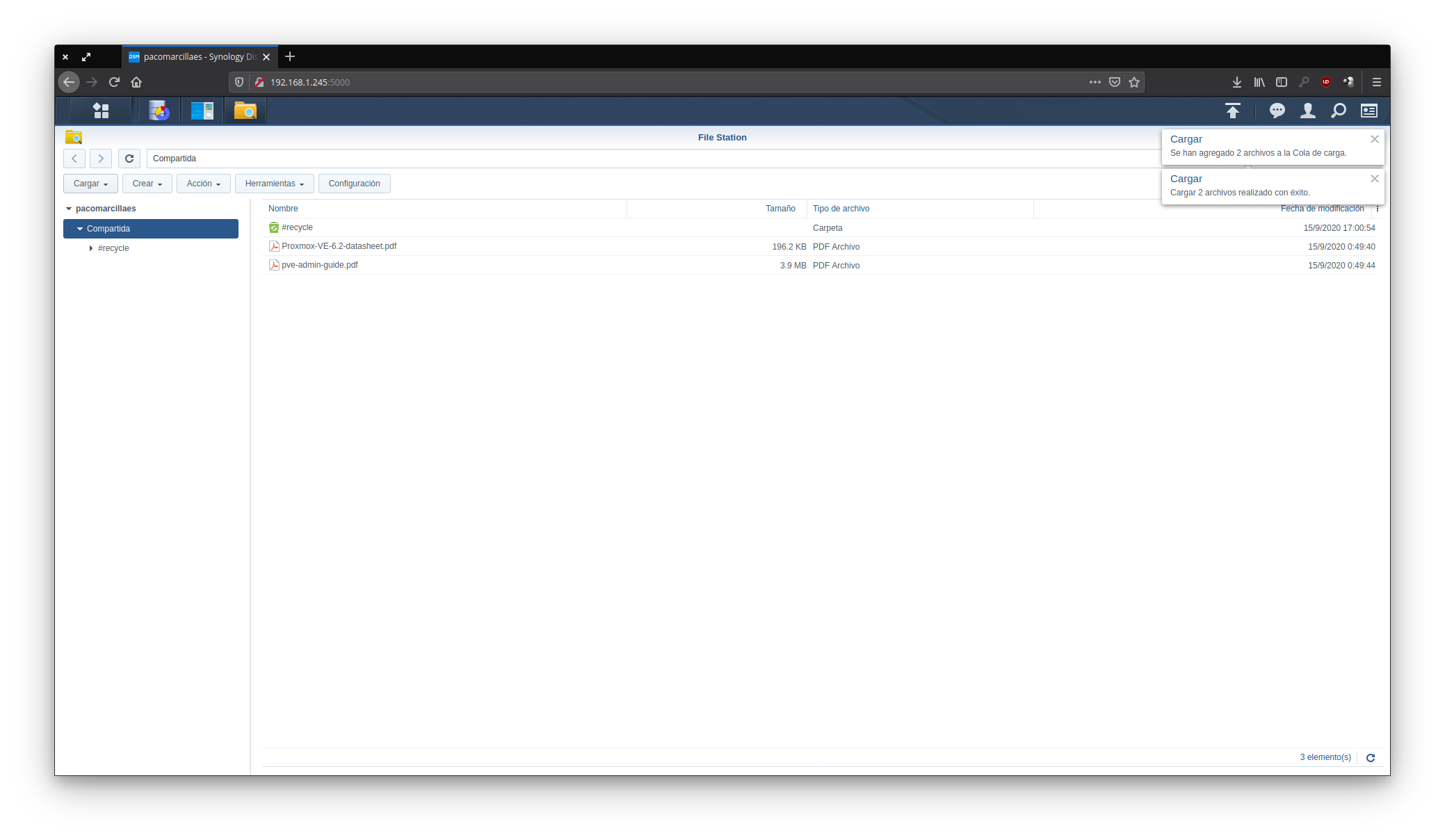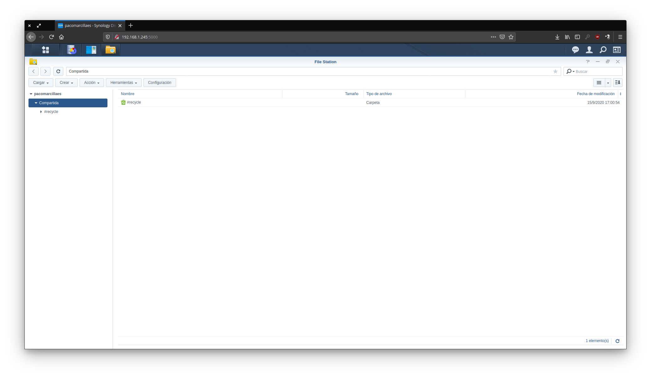- Si accedemos al menú y pinchamos en File station podremos ver nuestra carpeta compartida así como su contenido y podemos gestionarlo directamente desde la interfaz web. Esto es muy cómodo si estamos trabajando en remoto.