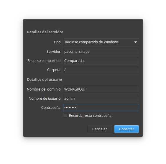 - Y ahora para acceder directamente desde nuestro equipo, sin usar el navegador, configuramos en nuestro explorador de ficheros la conexión. En mi caso utilizo Linux, pero en Windows sería algo similar.