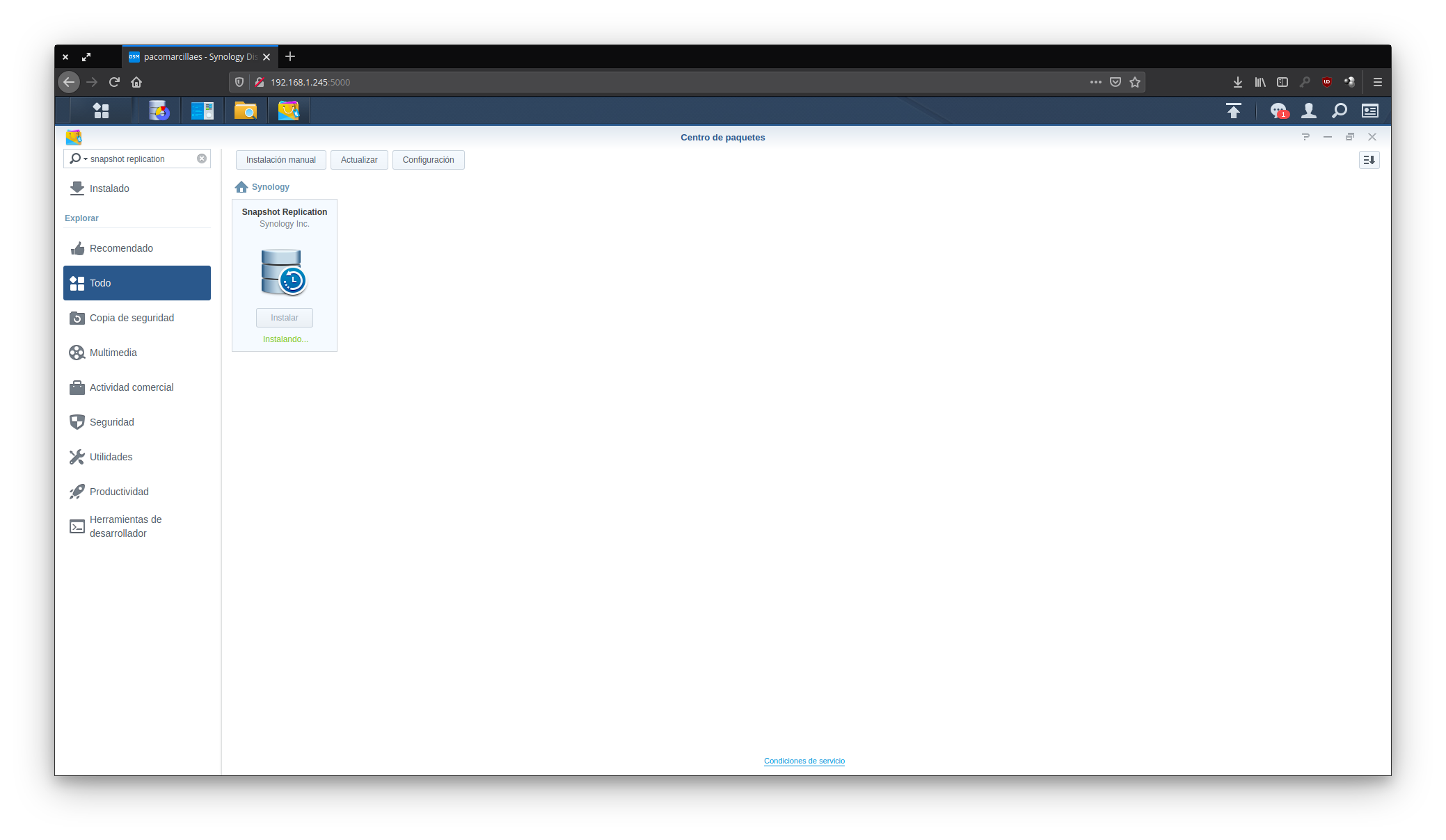 - Lo primero que vamos a hacer es ir al menú y pinchar en el Centro de paquetes. Buscamos la aplicación Snapshot replication y la instalamos.
