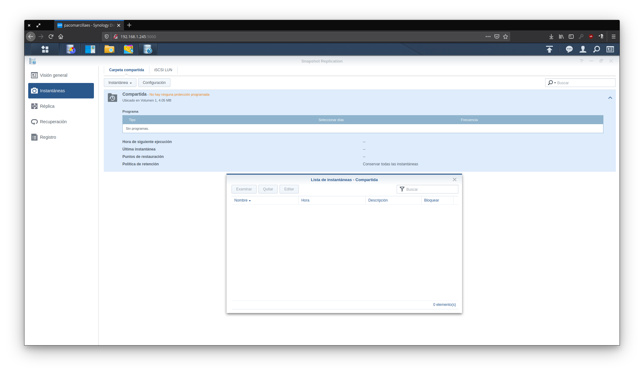 - Una vez instalada abrimos el Snapshot replication y vamos al apartado Instantáneas. Nos aparecerá nuestra carpeta Compartida. Si pinchamos en Instantáneas -> Lista de Instantáneas nos aparecerá un menú vacío, indicando que la carpeta compartida no tiene ninguna.