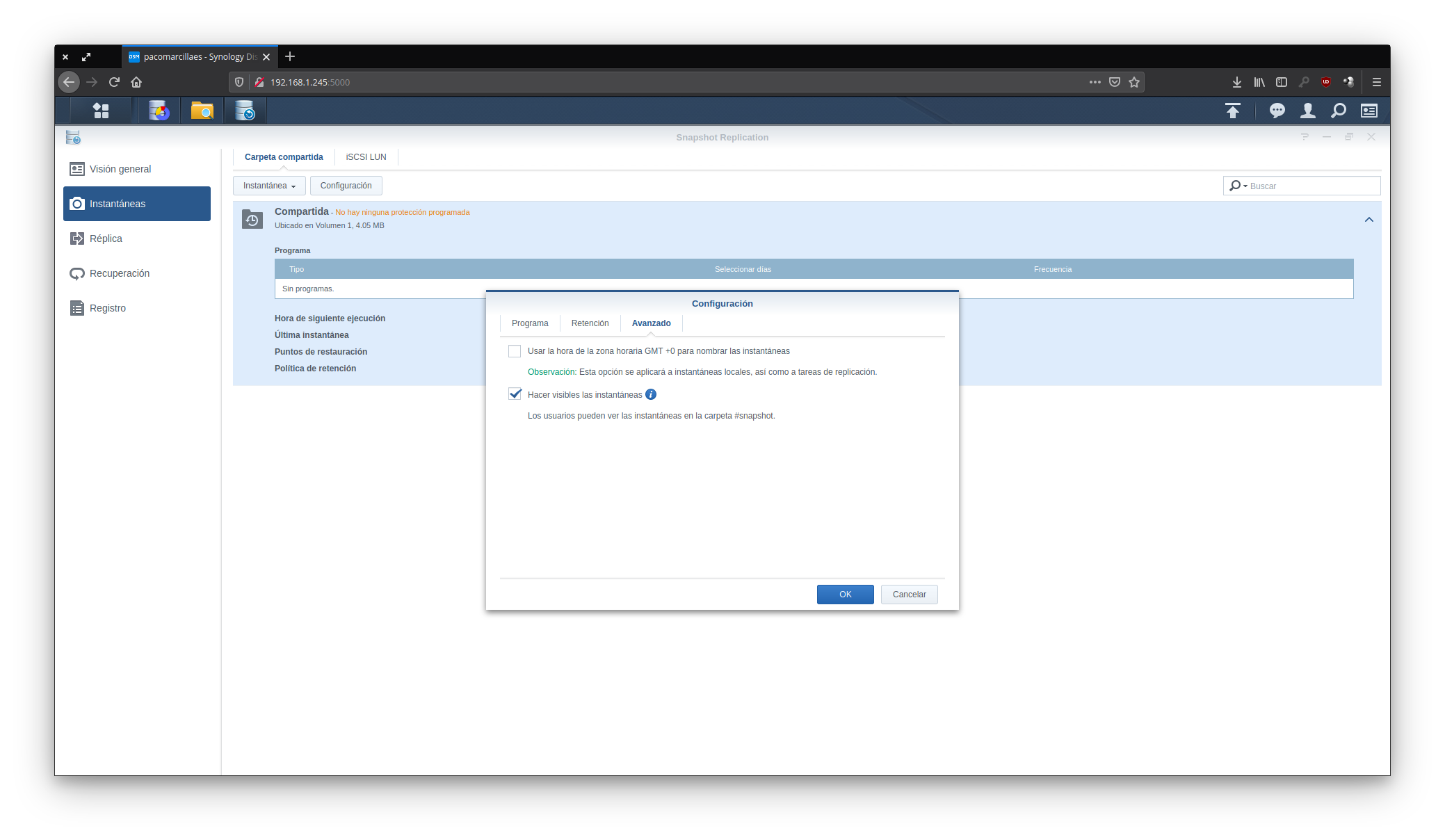 - Y ya por último, pinchamos en Configuración y vamos a la pestaña avanzada y marcamos la opción Hacer visibles las instantáneas para que los usuarios puedan verlas.